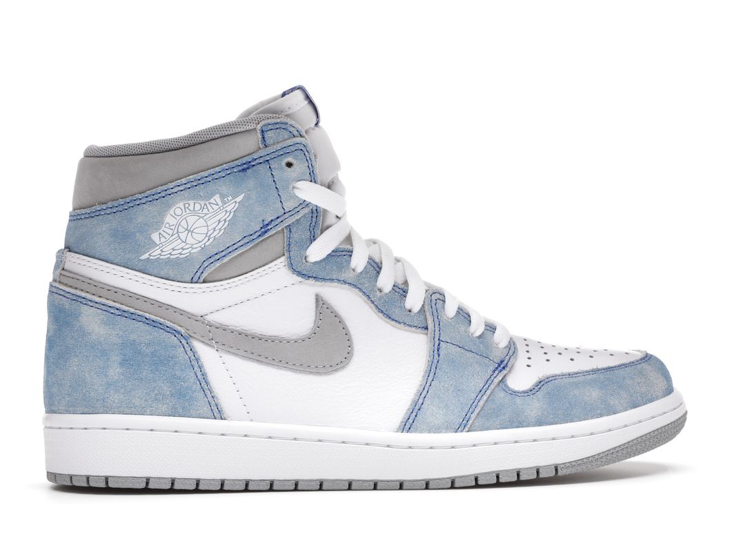The upper of the Air Jordan 1 Hyper Royal is constructed with white leather and distressed Hyper Royal suede overlays while the Swoosh and panels around the ankle are made with a Light Smoke Grey Durabuck. Consistent with Jordan 1s of the past, a classic white “Wings” logo appears on the lateral ankle. A blue woven Nike Air label stitched on the tongue, a white midsole, and a Light Smoke Grey outsole add the finishing touches to this retro design.
